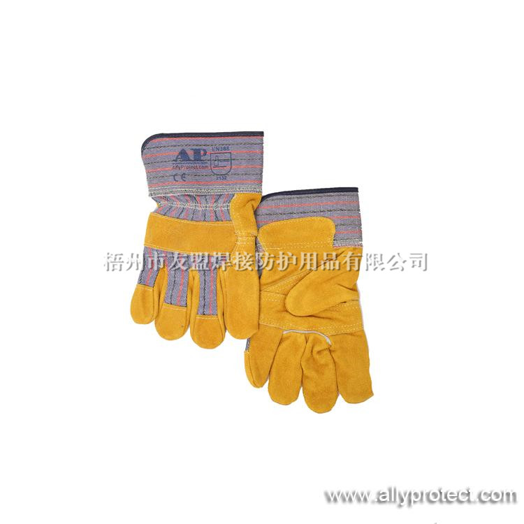 - 產品描述: [ AP ]掌位部分采用耐磨、抗穿插的金黃色牛二層皮,背布設計透氣性強,內里采用舒適吸汗的棉質內里,夾膠安全袖加強手腕防護,雙線縫制耐用性高。